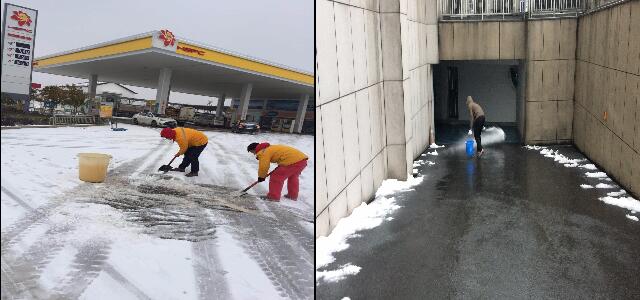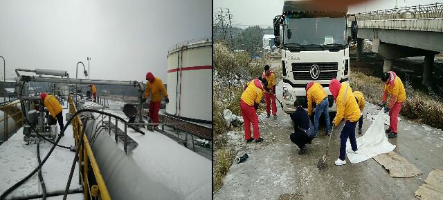 寒风中,油库一线员工为维护正常卸、发油而冒雪事情,检查设施设备状态;物流车队司机们风雪无阻,排除困难,定时按点将油品宁静送达客户、送到各站点;各个加油站下层员工通力相助,扫除油站积雪,保障油站进出通道顺流通行和行车宁静;总部行政、物业人员也实时给办公楼前坪进行扫雪、除冰,为行政办公务情保驾护航。